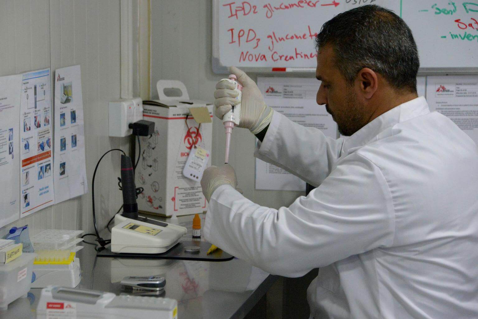 A staff member works at a lab in the Doctors Without Borders (MSF) hospital in Iraq's Mosul.