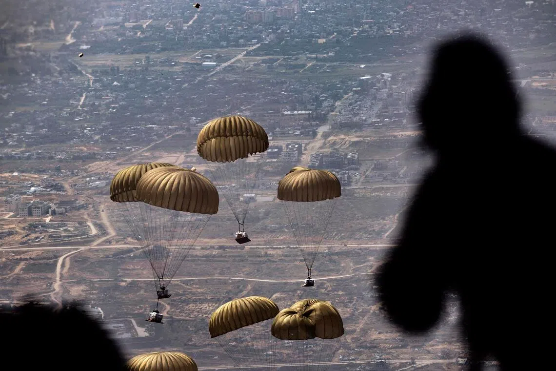 A Jordanian Air Force C-130 dropping humanitarian aid supplies over northern Gaza in March 2024.