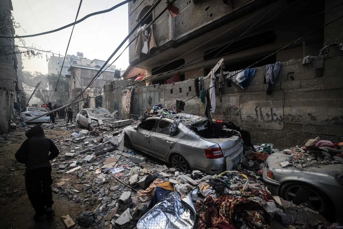 A street in Rafah, in southern Gaza, is devastated by Israeli bombardment on Feb 9, 2024.