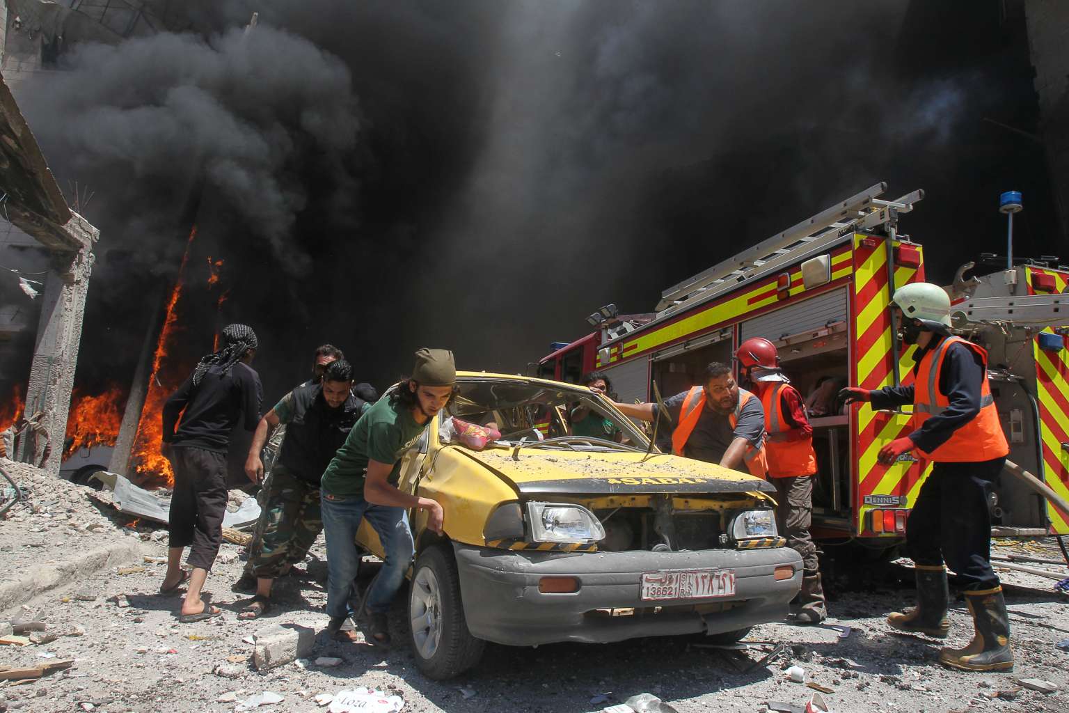Civil defence officers and rescuers pushing a car away from a site hit by air strikes in Idlib city, Syria, on June 12, 2016.