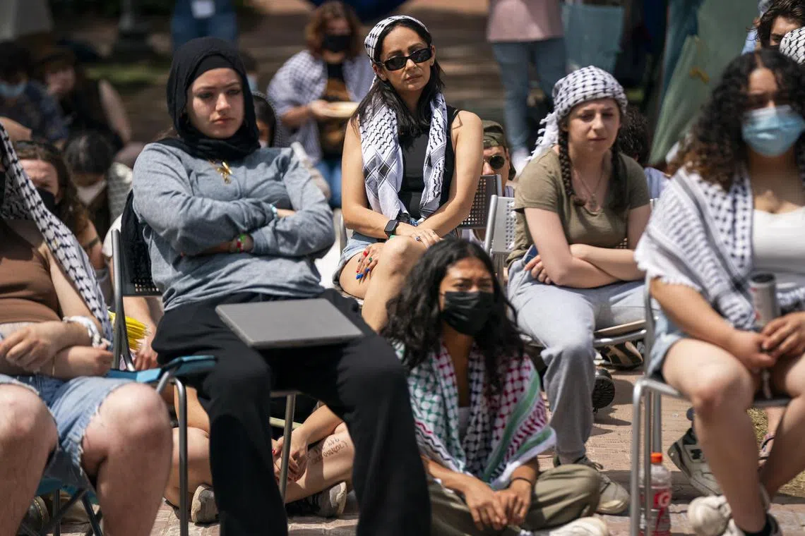 Activists take part in a community meeting at an ongoing encampment of pro-Palestinian protesters at George Washington University in Washington.