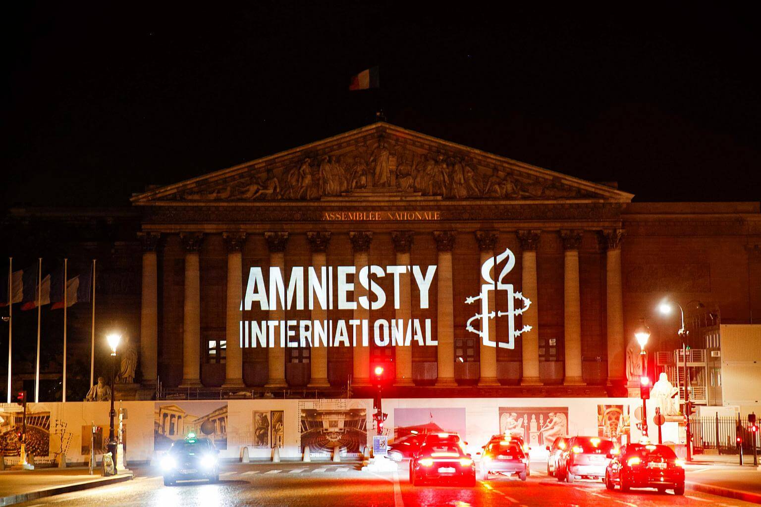 The logo of NGO Amnesty International projected onto the Palais Bourbon, the seat of the French national assembly, on June 18, 2018.