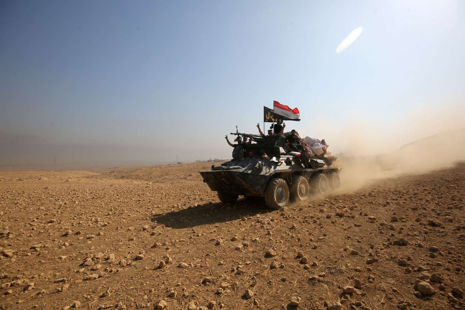 Members of Iraqi forces flash the sign of victory on their vehicle as they advance towards the Hammam al-Alil area, south of Mosul, on Nov 6, 2016.