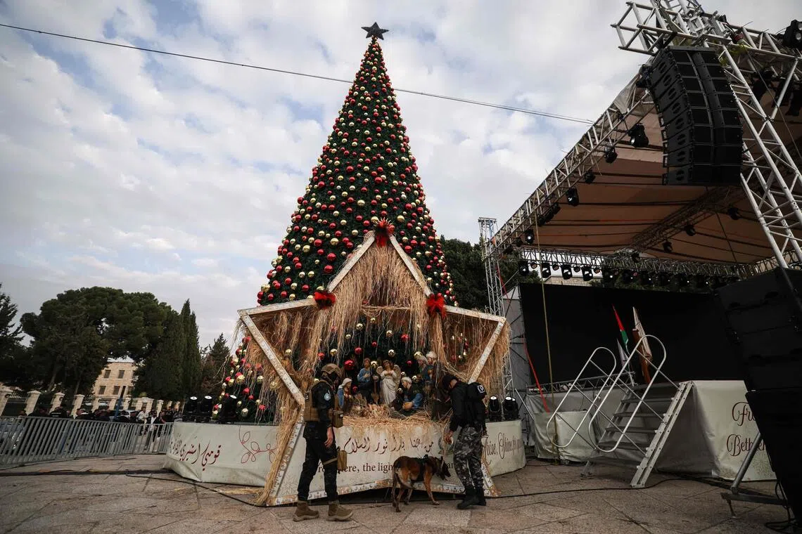 A Palestinian police officer from the K9 unit checks Christmas decorations before a Christmas tree lighting ceremony in Bethlehem.