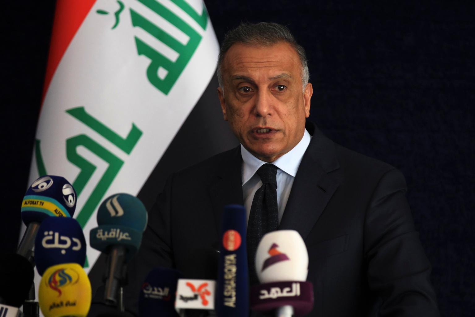 Iraqi Prime Minister Mustafa al-Kadhemi speaks during a press conference in Basra, Iraq, on July 15, 2020.