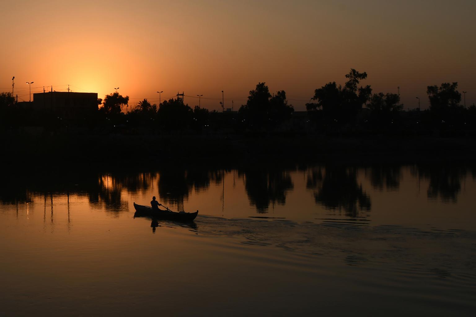 A fisherman rows his boat along the Euphrates river at sunrise, in Nasiriyah, Iraq, on July 5, 2020.