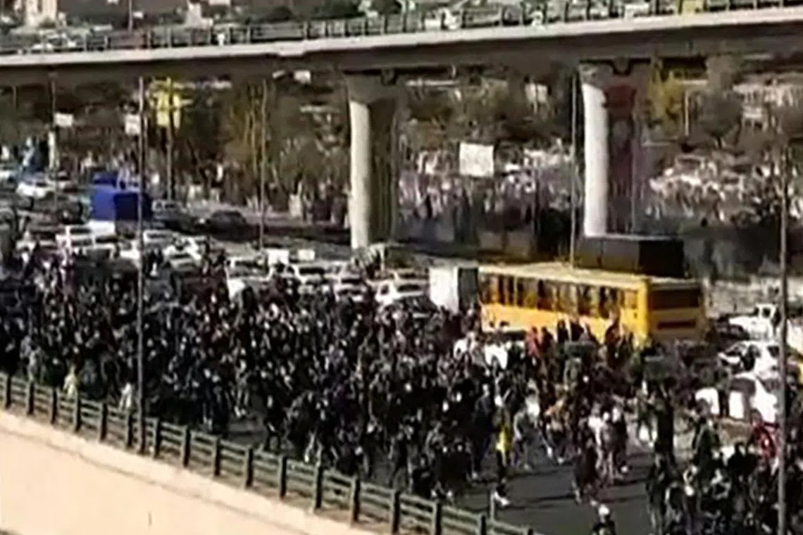 Protesters marching along a highway in Iran’s northern city of Karaj on Nov 3.
