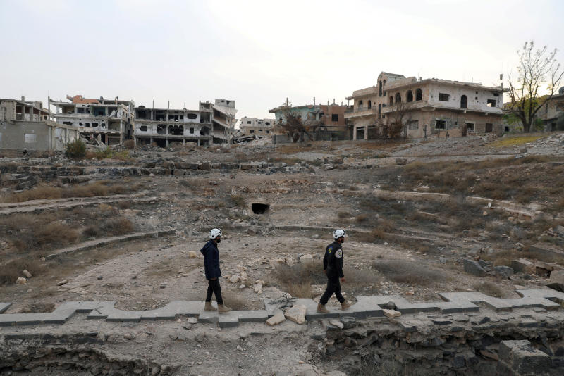 Members of Syria Civil Defence, also known as the "White Helmets", are seen inspecting the damage at a Roman ruin site in Daraa, Syria, on Dec 23, 2017.