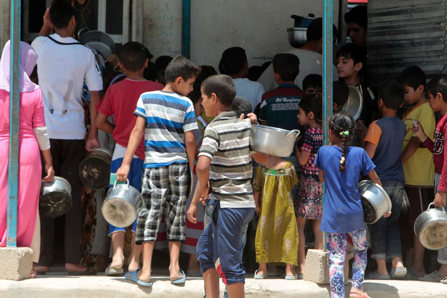 Displaced Iraqis line up to collect donated food at the Alexanzan camp in the Dora neighbourhood in the outskirts of Baghdad, on May 31, 2106.