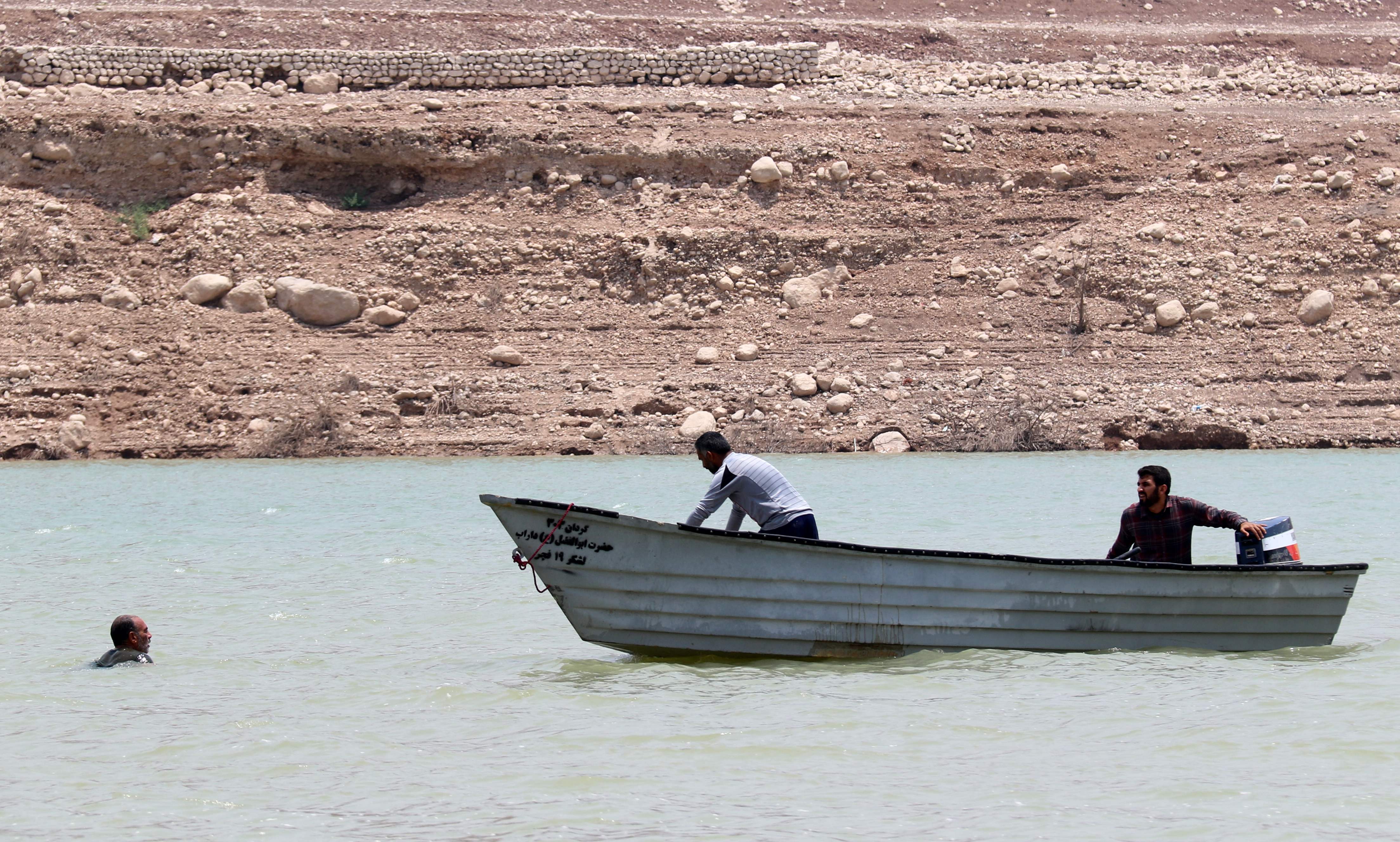 A boat reaches a man in a river in Iran, after heavy rainfall causes flooding.
