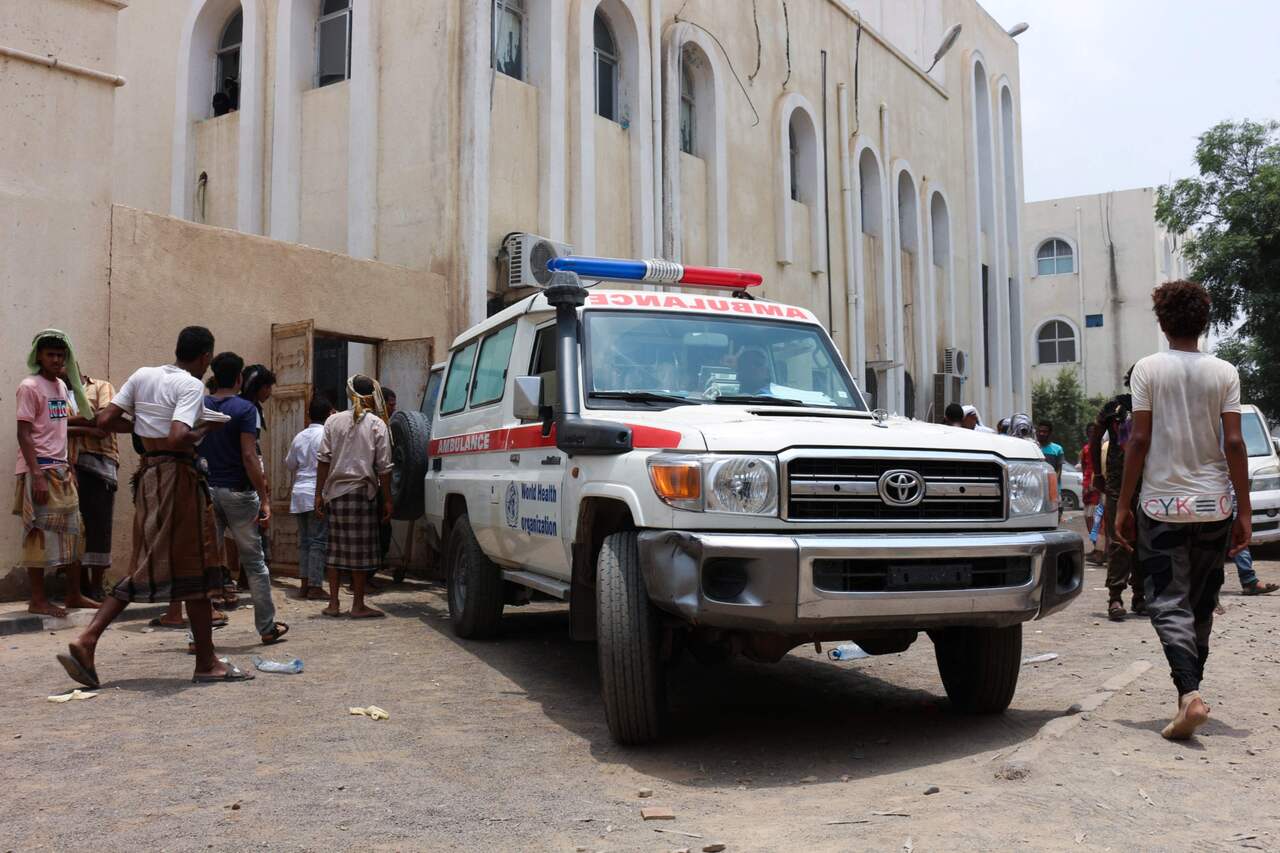 An ambulance transporting casualties from al-Anad air base to the Ibn Khaldun hospital in Lahj province, Yemen, on Aug 29, 2021.