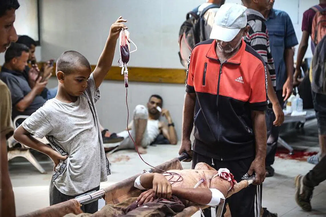 A Palestinian boy raising a pack of blood as a man who was injured at a food distribution point in Gaza receives treatment in a hospital on July 19.