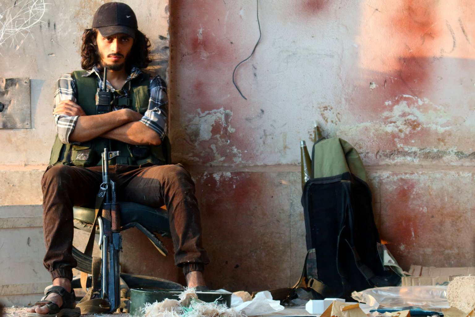 A rebel fighter sits with his weapon in the artillery academy of Aleppo, Syria, Aug 6, 2016.