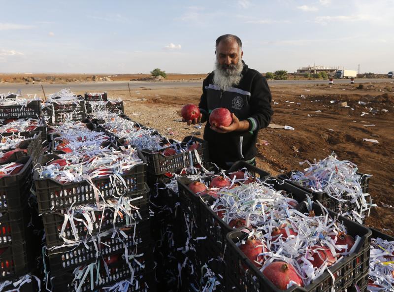 Syrian vendor Abu Alaa waits for Jordanian customers to sell them pomegranate at the recently reopened Nassib border post in Deraa province on Nov 7, 2018.