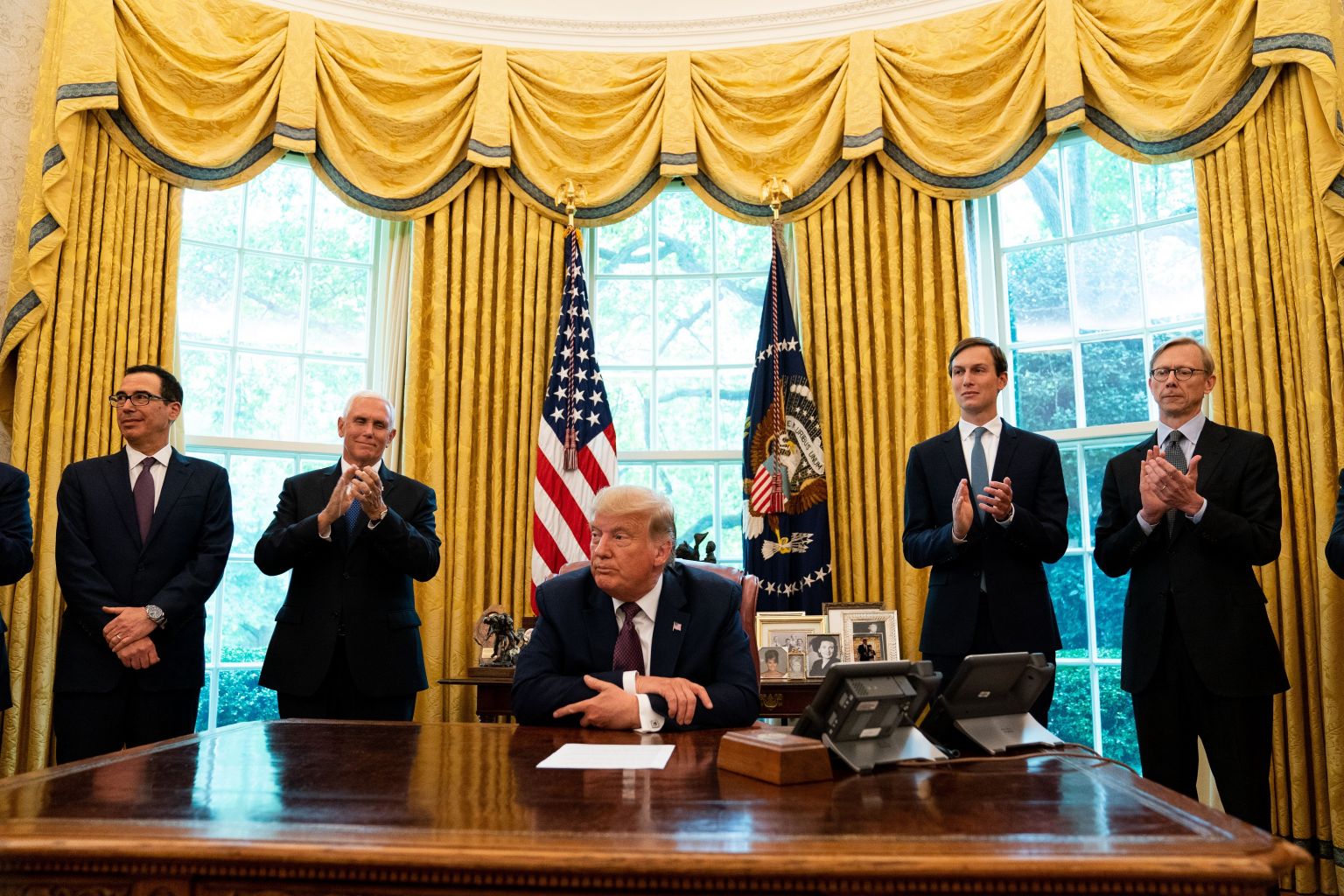 Trump (centre) sits during a press conference on Israel and Bahrain establishing full diplomatic ties.