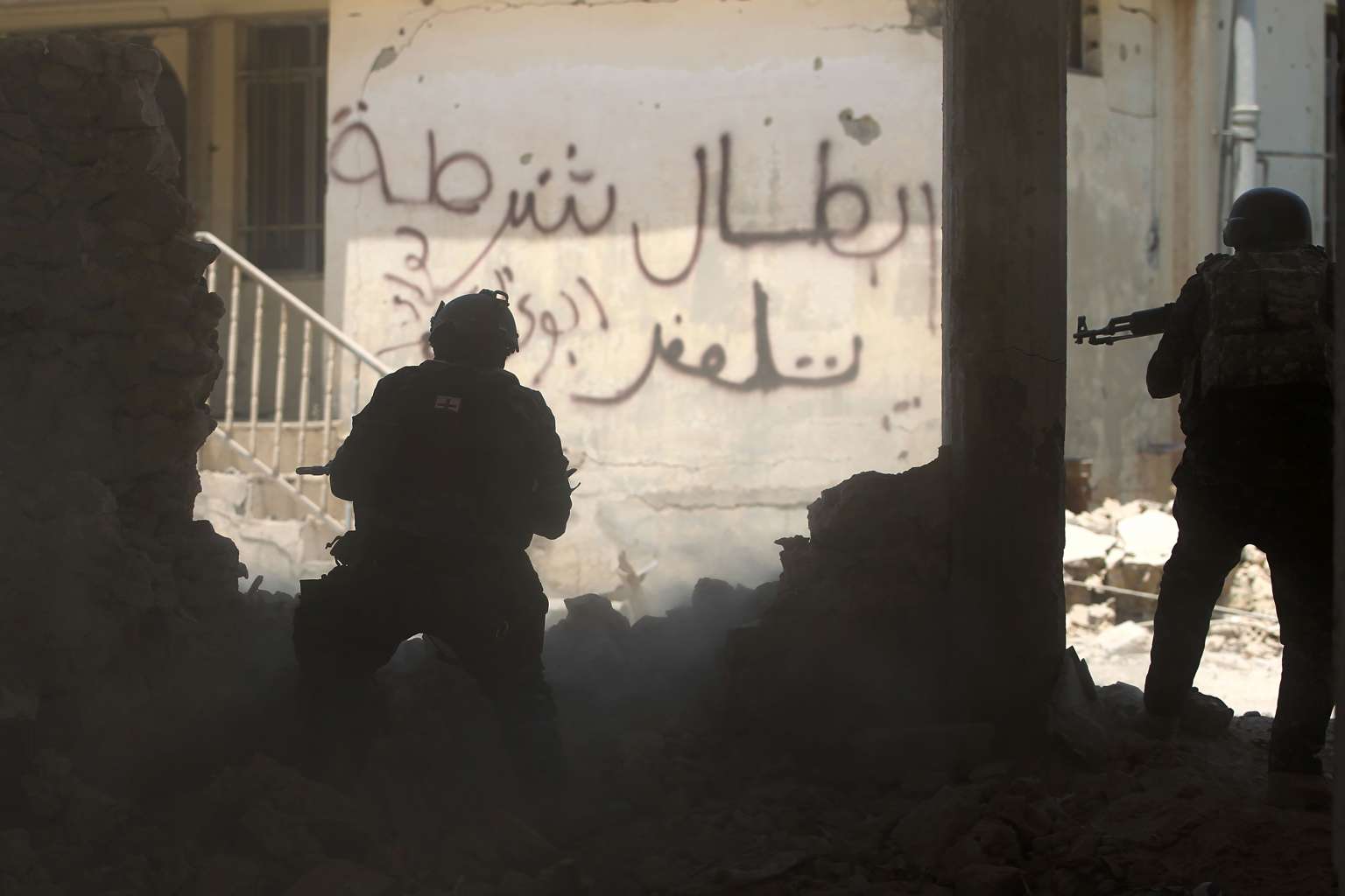 Iraqi soldiers holding their positions as they fought ISIS fighters on June 19, 2017, during a battle to retake the last district of the Old City of Mosul still held by the jihadists. But the intensity of fighting was lower than a day earlier when the assault began.