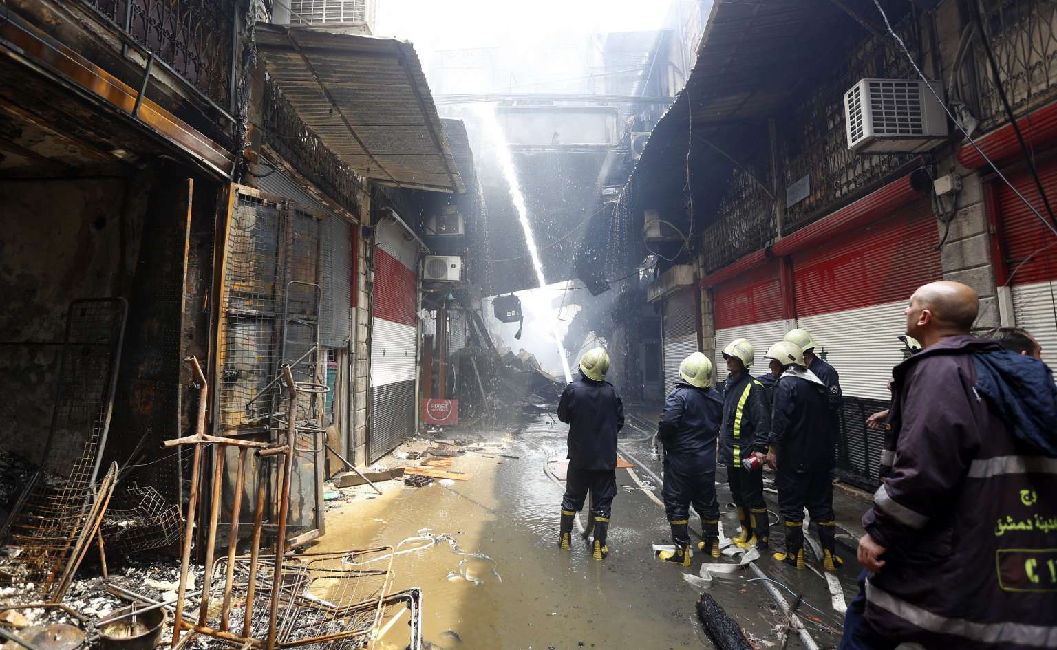 Firefighters spray water on burned shops at al-Asroneiyeh area in the old city of Damascus, Syria, on April 23, 2016.