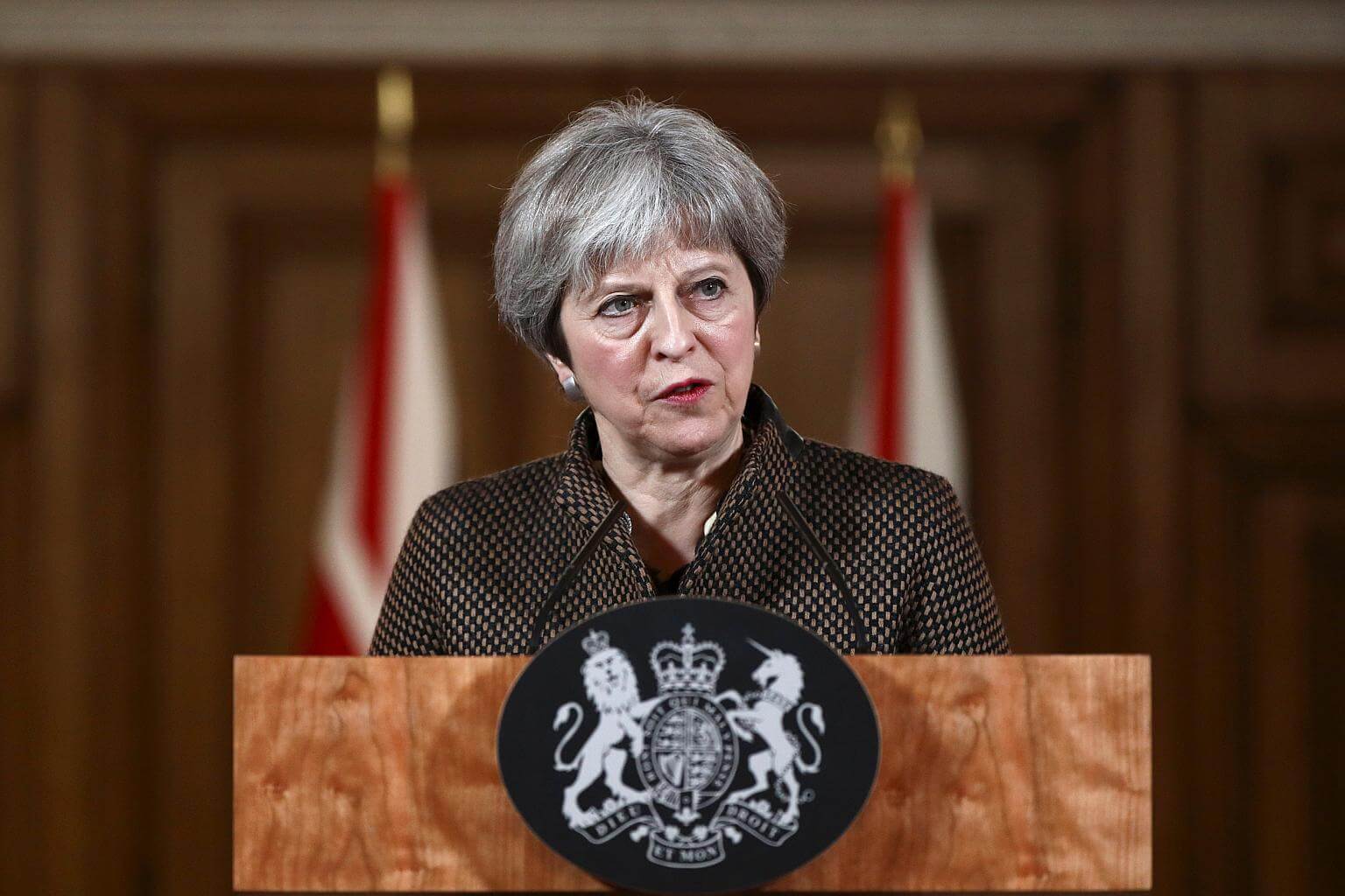 British Prime Minister Theresa May gives a press conference at Downing Street in central London, following British military action against Syria on April 14, 2018.