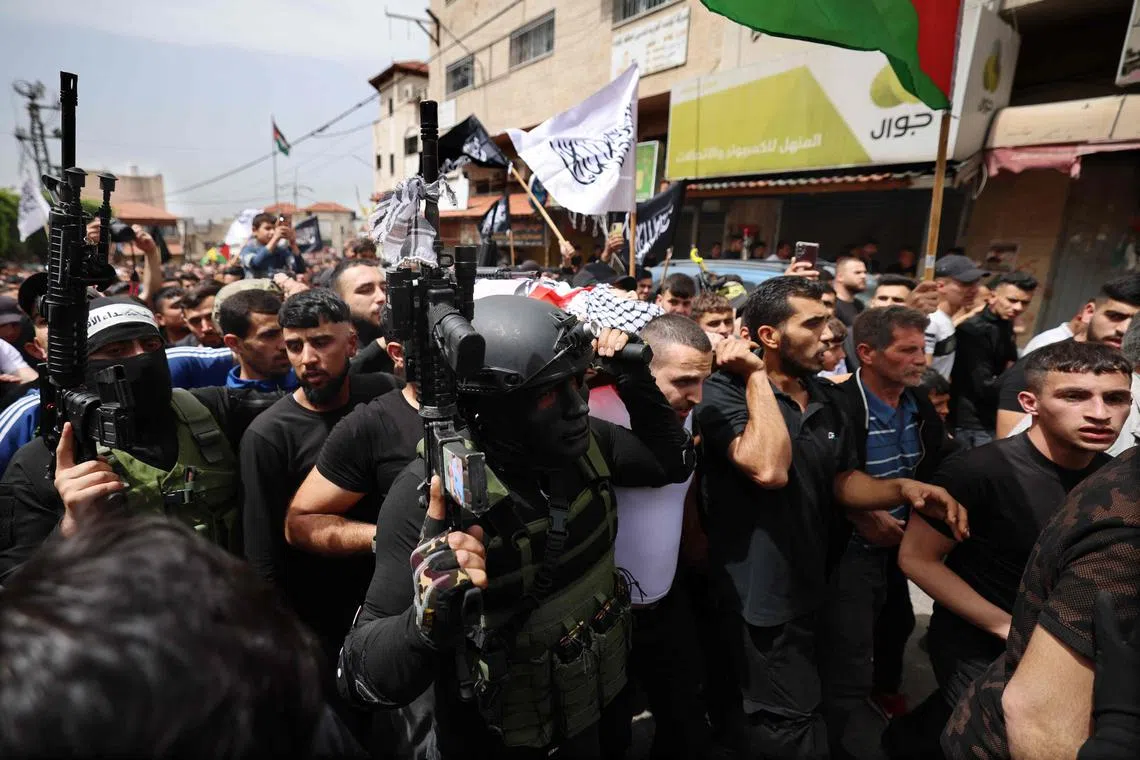 Palestinian mourners carry the body of Ayed Slim, who was shot dead by Israeli soldiers in the West Bank, during his funeral in the village of Azzun in the occupied West Bank, on April 9, 2023.