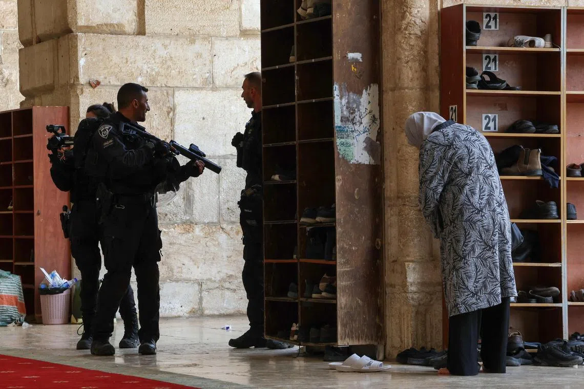 Israeli security forces stand guard at the Al-Aqsa mosque compound, also known as the Temple Mount complex to Jews, in Jerusalem.
