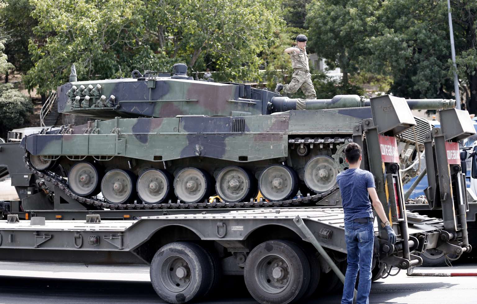 Turkish soldiers loading the tanks on to transporters to return them to military bases, in Istanbul, following a failed coup attempt, on July 17, 2016.