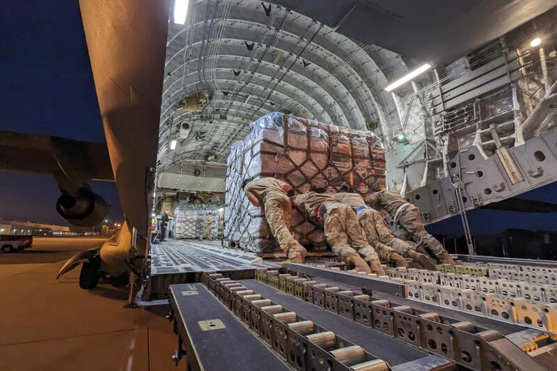 Supplies for a US urban search and rescue team from Fairfax County, Virginia, being loaded onto a transport plane for a flight to Turkey.