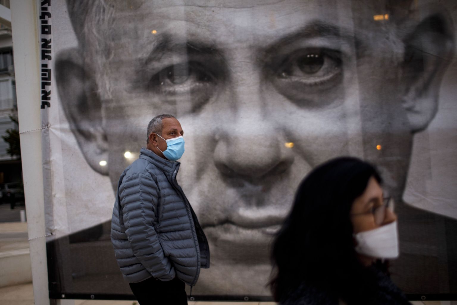 Protesters take part in a demonstration against Netanyahu in Tel Aviv, in front of a portrait of the PM.