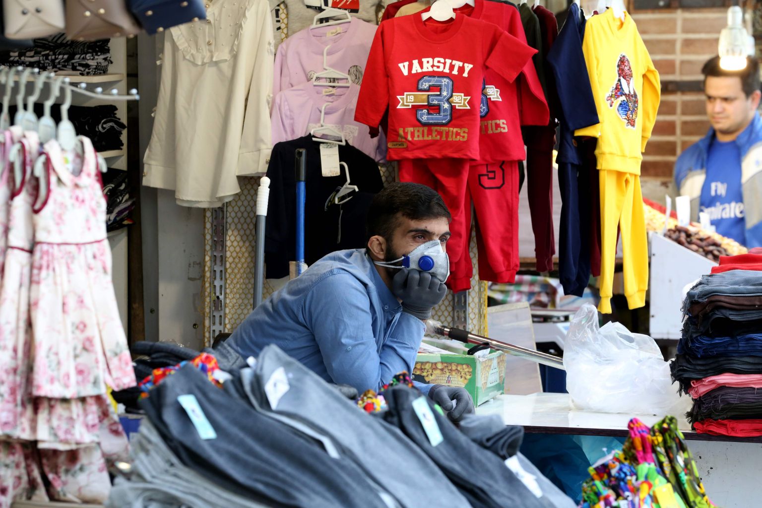 An Iranian shopkeeper watches the street from a clothes stall at the Grand Bazaar market in Teheran, April 18, 2020.