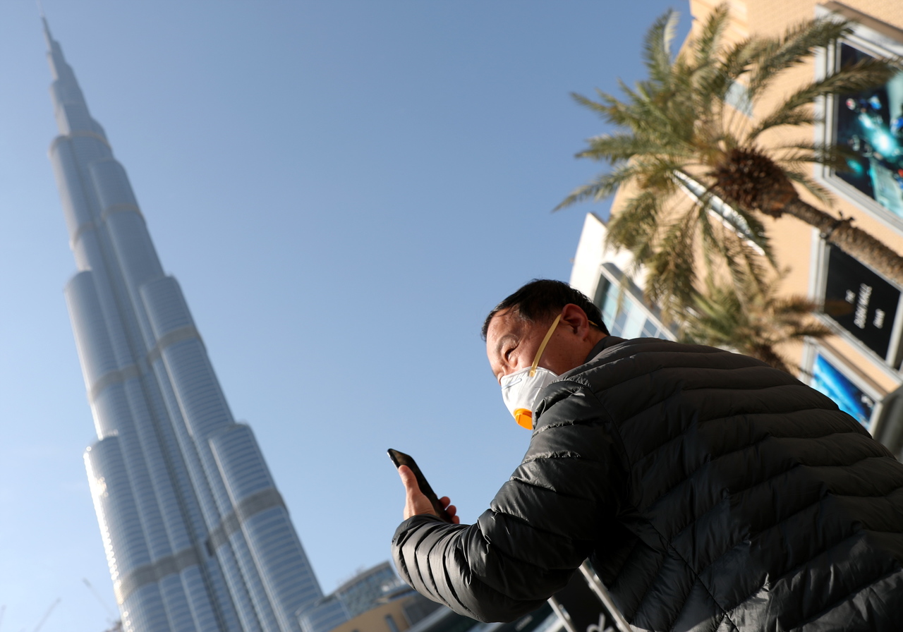 A man in a face mask taking a photo of the Burj Khalifa in Dubai, United Arab Emirates, on Feb 1, 2020.