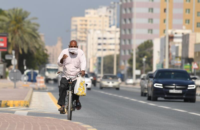 A worker with a protective mask rides a biike on a street in Sharjah, in the United Arab Emirates, on March 26, 2020.