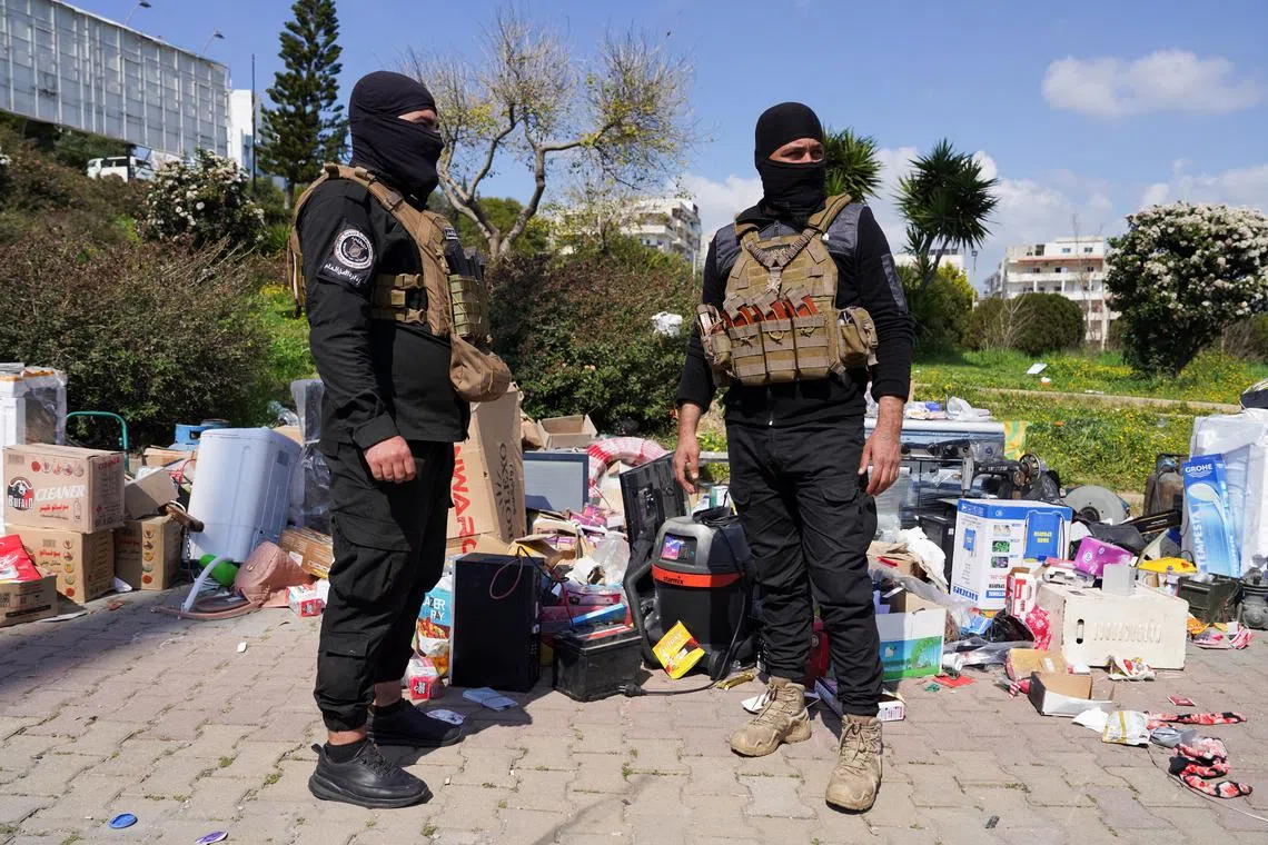 Members of Syrian security forces standing near belongings in Latakia, Syria, on March 10.