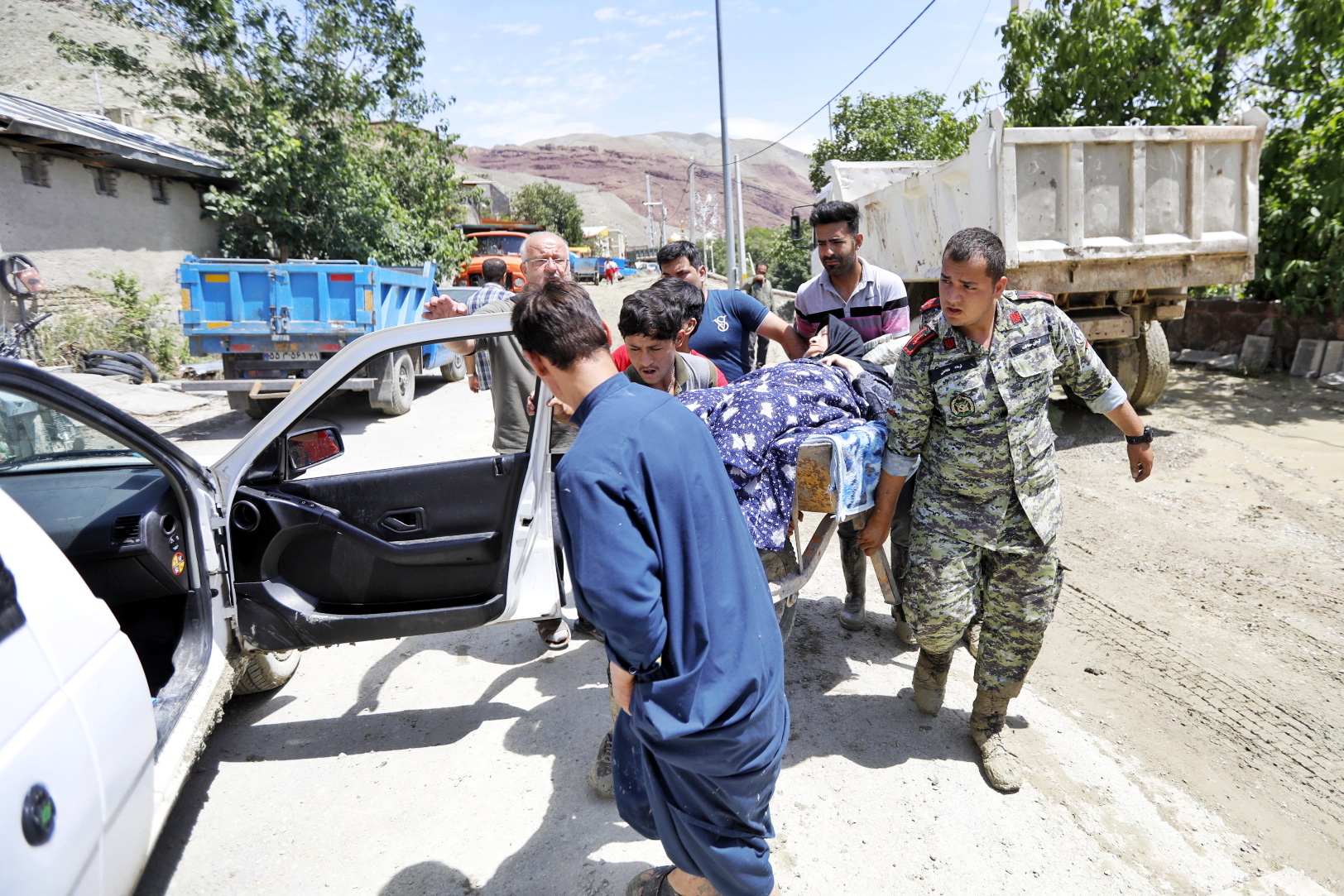 Rescuers carry an injured woman after floods in Firuzkuh, Iran, on July 30, 2022.