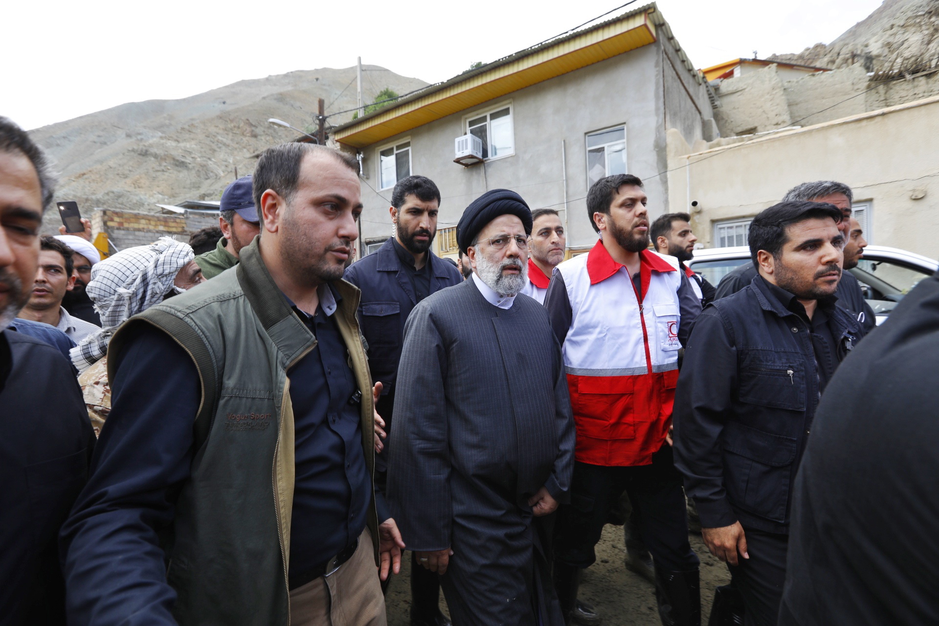 Iranian President Ebrahim Raisi (centre) visits Firuzkuh, in Iran, after the floods, on July 30, 2022.