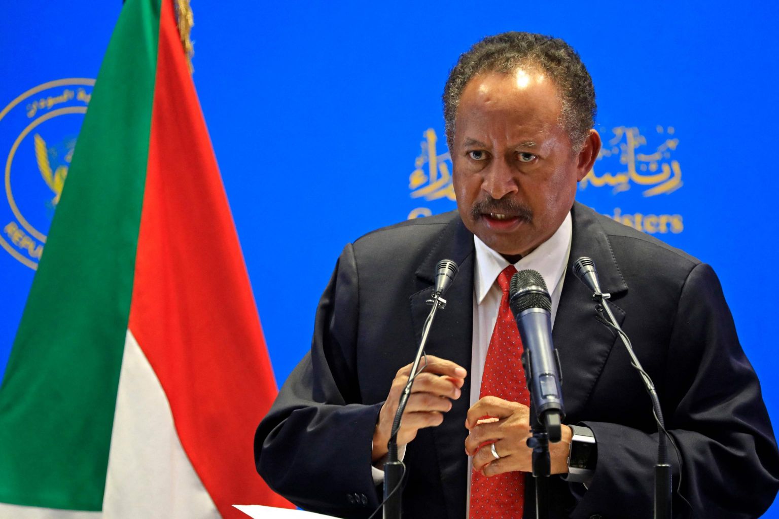 Mr Abdalla Hamdok giving a speech in Sudan's capital of Khartoum on Aug 15, 2021. His detention had sparked a global outcry.