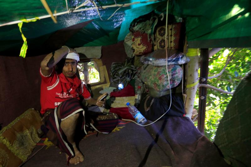 Ahmed Hobeishi, inside his tree house built on a big tree in the middle of a public street, in Sanaa, Yemen, on Oct 4, 2018.