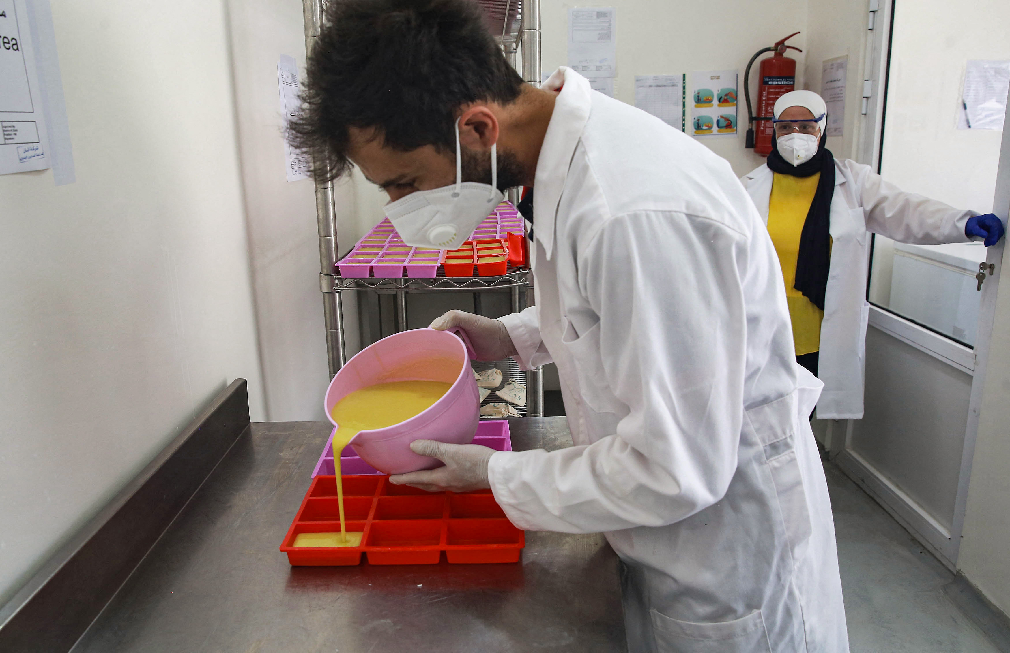 Now in her 60s, she helps mix ingredients in their company's Amman workshop in a large steel bowl, wearing a white face mask and blue gloves.
