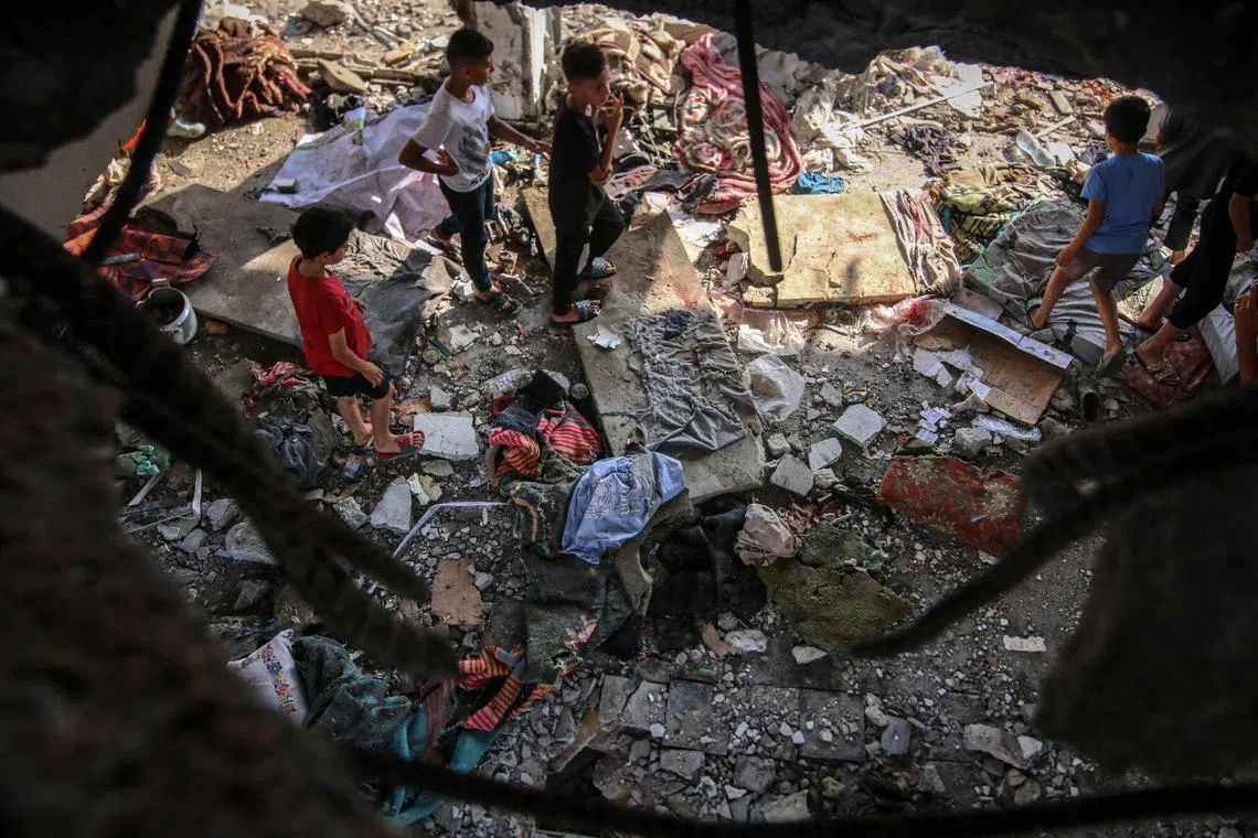 Children walking in the rubble of a school where displaced Palestinians were sheltering when it was hit by an Israeli strike, in central Gaza.
