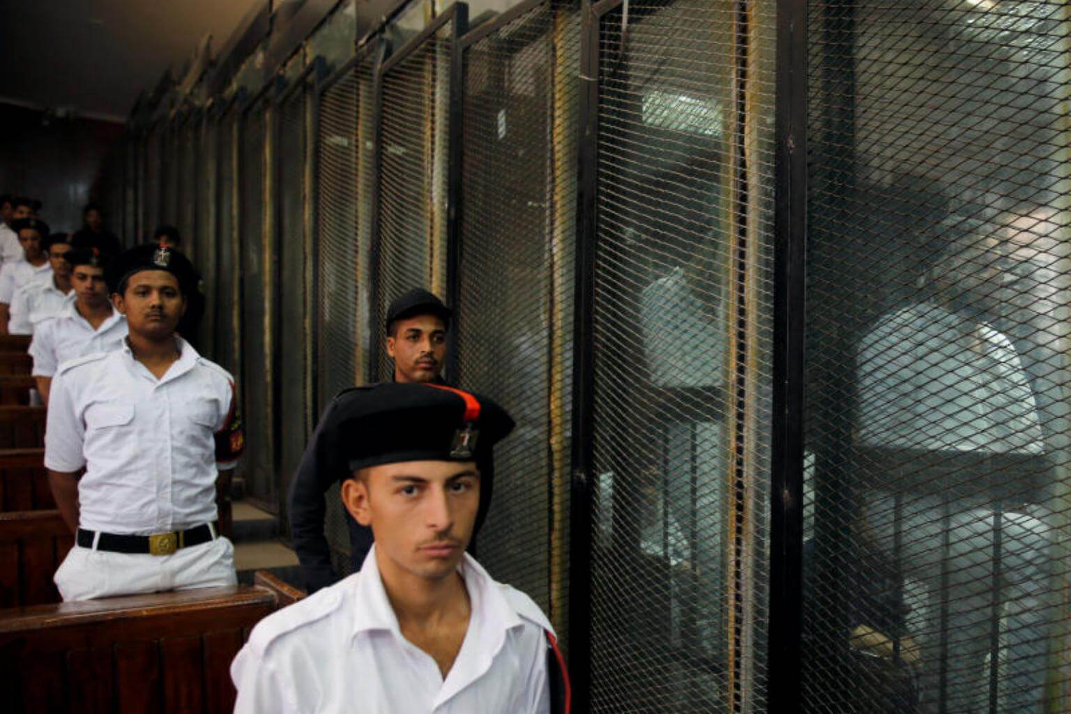 Police officers stand guard as defendants accused of involvement in the 2015 assassination of Egypt's top prosecutor are seen in a cage in a courtroom, on the outskirts of Cairo, on June 17, 2017.