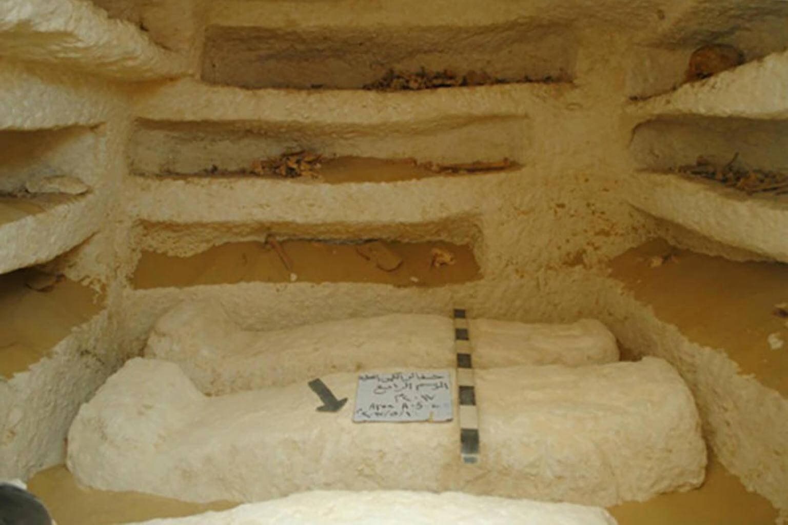 One of the tombs, which was reached through a shaft carved in rock, contained four sarcophagi each, and sculpted to depict a human face Another tomb held the remains of two sarcophagi and six burial holes, including one for "the burial of a small child".