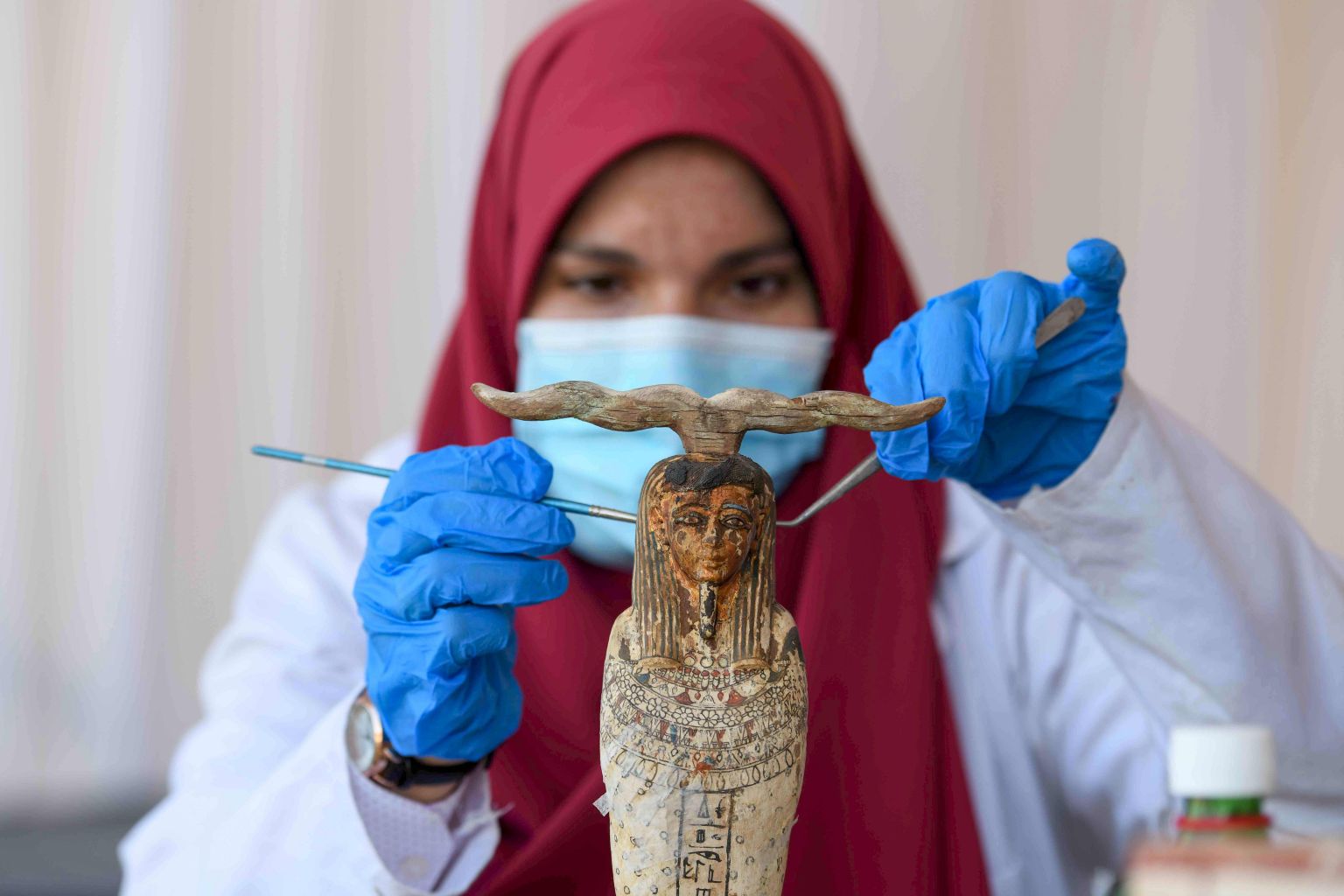 A November 2020 photo shows an archaeologist cleaning a statue at the Saqqara necropolis