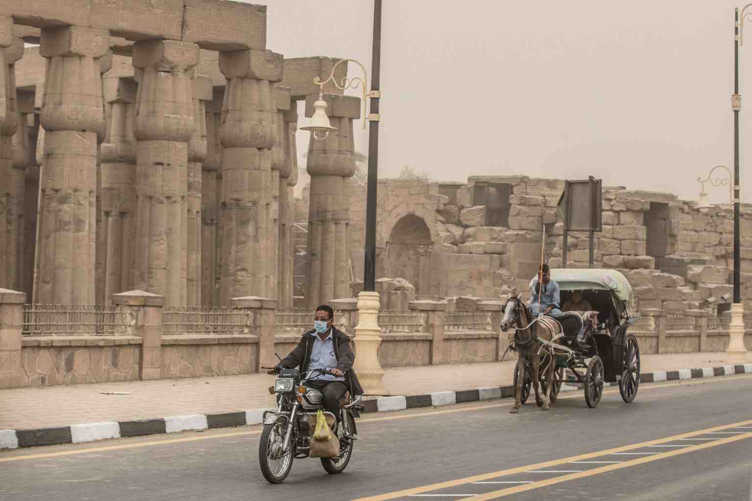 A mask-clad Egyptian rides his motorcycle amid a sandstorm near the Luxor Temple in Luxor, Egypt, on March 12, 2020.