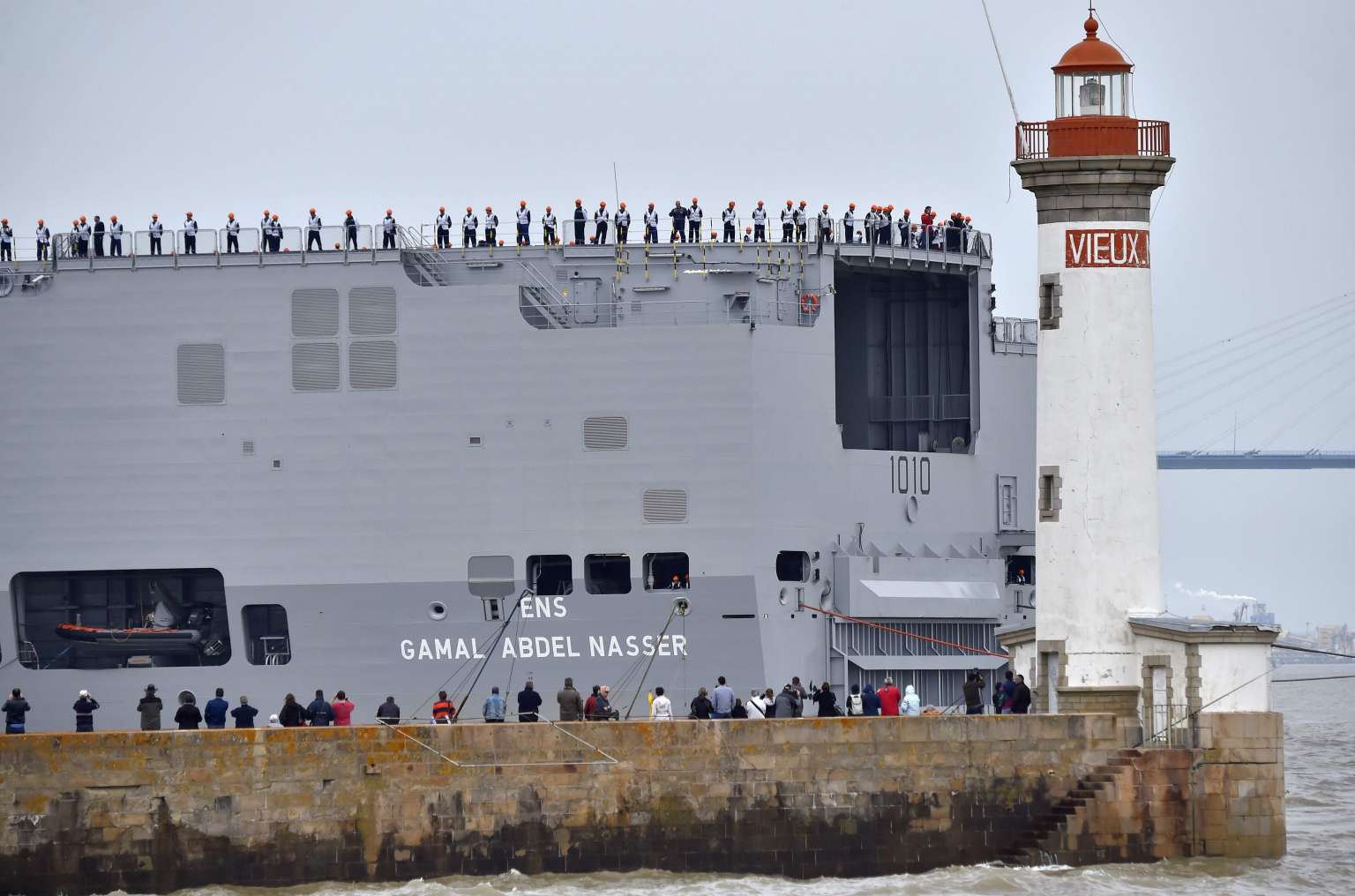Sailors standing on board the Gamal Abdl Nasser (ex-Vladivostok) Mistral class ship on May 6, 2016, in Saint-Nazaire, western France.