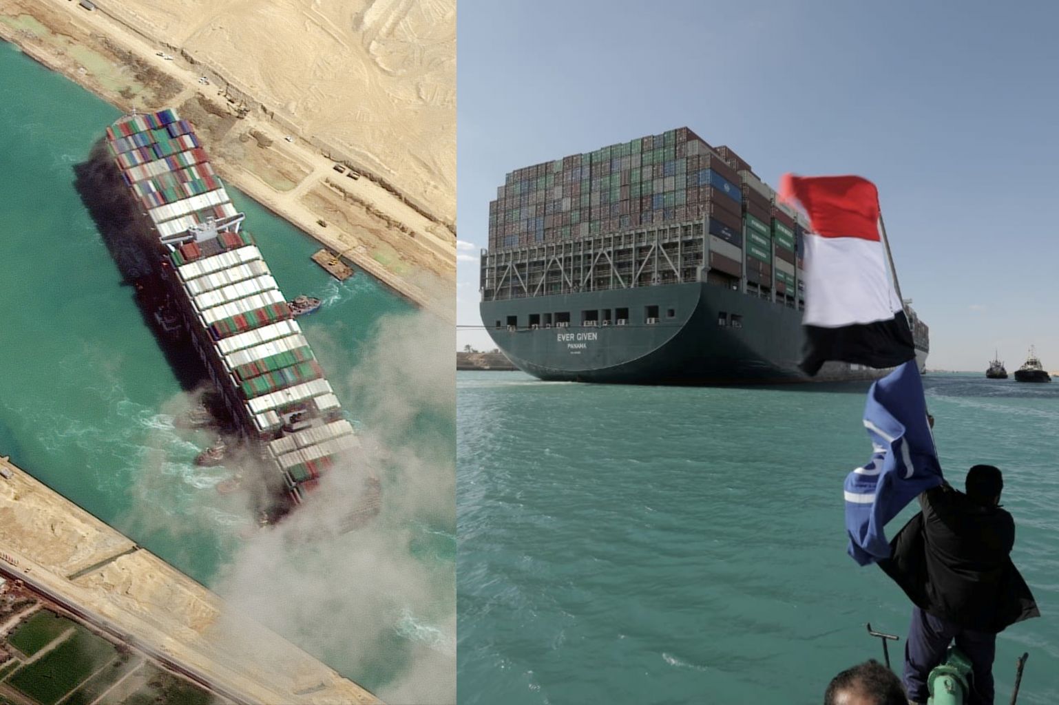 The Ever Given blocking the Suez Canal (left) and sailing on after it was freed (right).