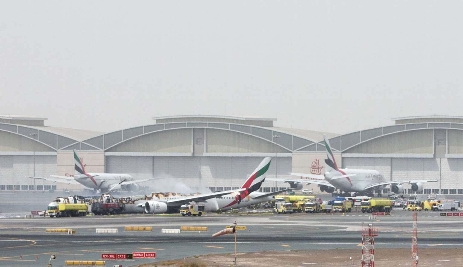 Emirates flight EK521 is seen after it crash-landed at Dubai International Airport, the UAE, on Aug 3, 2016.