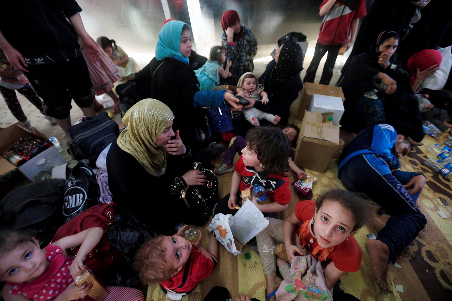 Displaced Iraqi families who fled from Islamic State militants wait for a security check in Mosul, Iraq on July 3, 2017.