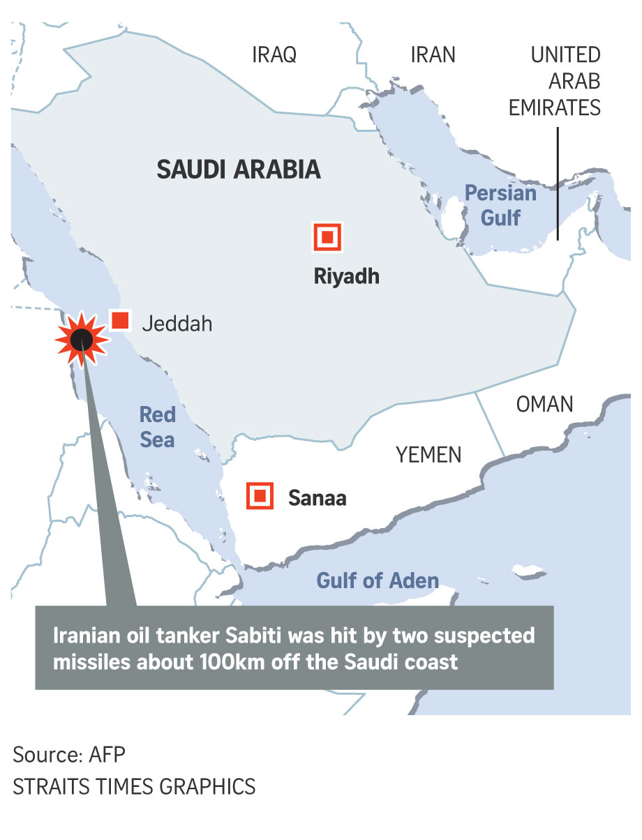 The National Iranian Tanker Company, which owns the ship, said the hull of the Sabiti was hit by two separate explosions off the Saudi port of Jeddah, saying they were "probably caused by missile strikes".