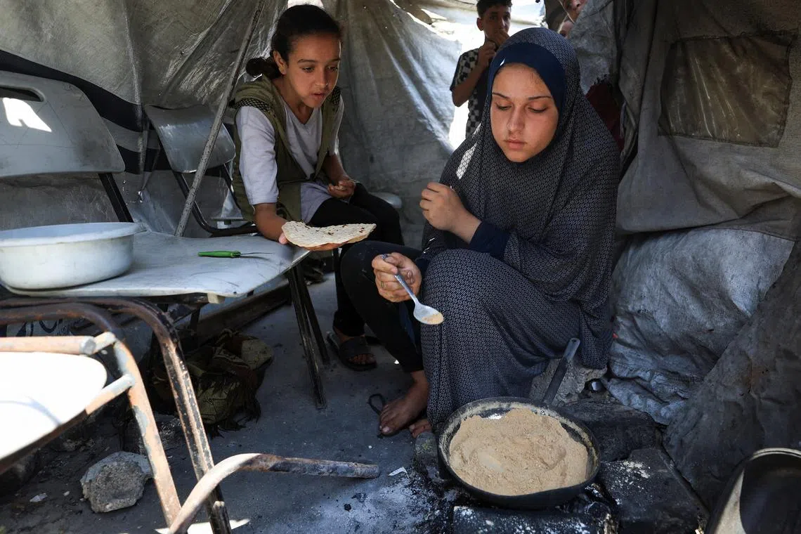 Ms Sabrine Toushtash preparing dukkah for her children inside a tent shelter, amid food scarcity and a hunger crisis, in Gaza City.