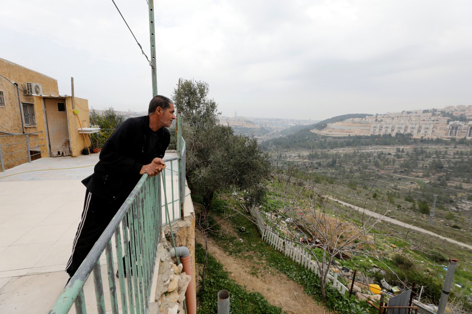 Palestinian man Omar Hajajla, who is cut off with his family from the rest of their village by the Israeli wall, looks out of his house at the Israeli settlement of Gilo, in Al-Walaja village near Bethlehem, on Feb 18, 2020.