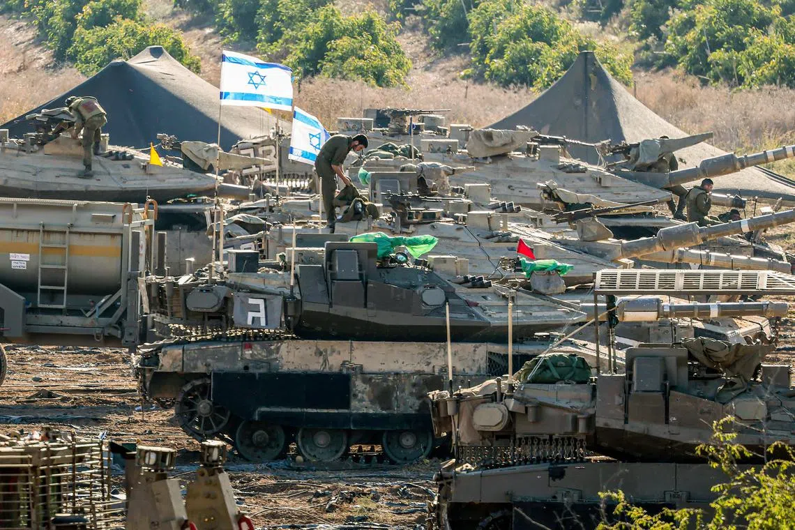 Israeli soldiers and armoured vehicles gathered at an undisclosed location near the border with Gaza, in Israel, on Oct 21.