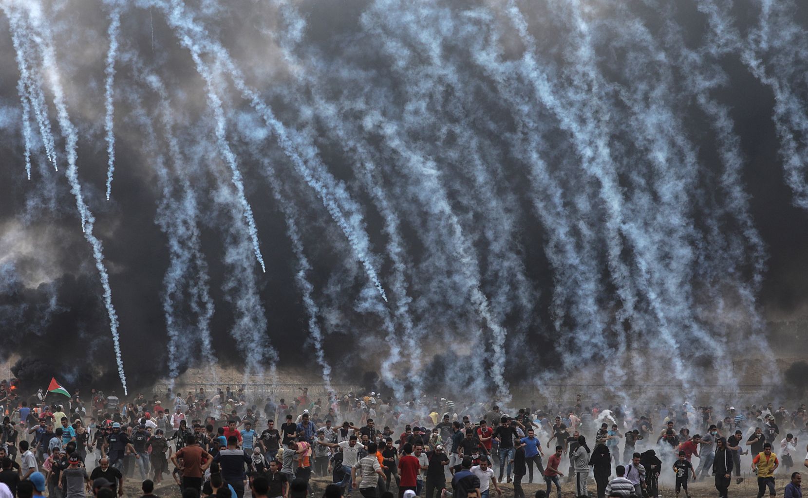 Israeli army soldiers fire tear-gas at Palestinians protesters during clashes on May 4, 2018.